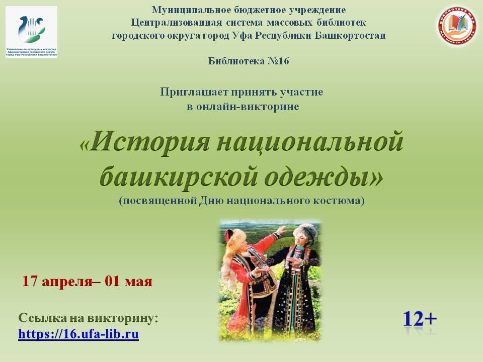 Библиотека № 16 МБУ Централизованной системы массовых библиотек ГО г. Уфа РБ проводит онлайн-викторину «История национальной башкирской одежды», посвященную Дню национального костюма.