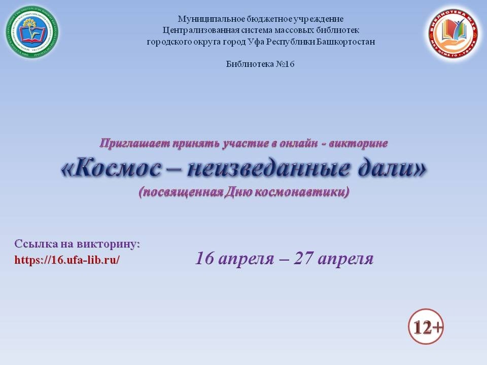 Библиотека № 16 МБУ Централизованной системы массовых библиотек ГО г. Уфа РБ проводит онлайн-викторину «Космос — неизведанные дали», посвященную Дню космонавтики.
