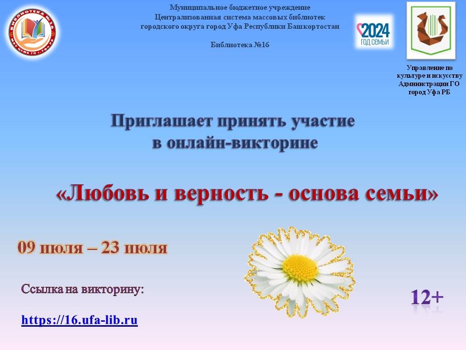 Библиотека № 16 МБУ Централизованной системы массовых библиотек ГО г. Уфа РБ проводит онлайн-викторину «Любовь и верность - основа семьи», посвященную Дню семьи, любви и верности.