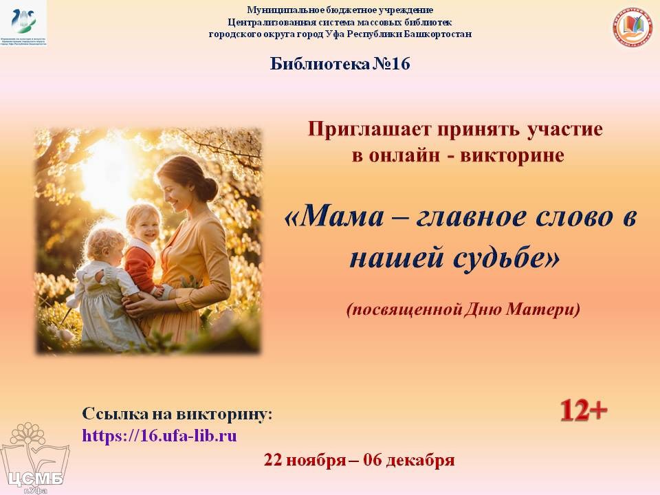 Библиотека № 16 МБУ Централизованной системы массовых библиотек ГО г. Уфа РБ проводит онлайн-викторину «Мама – главное слово в нашей судьбе», посвященную Дню Матери.