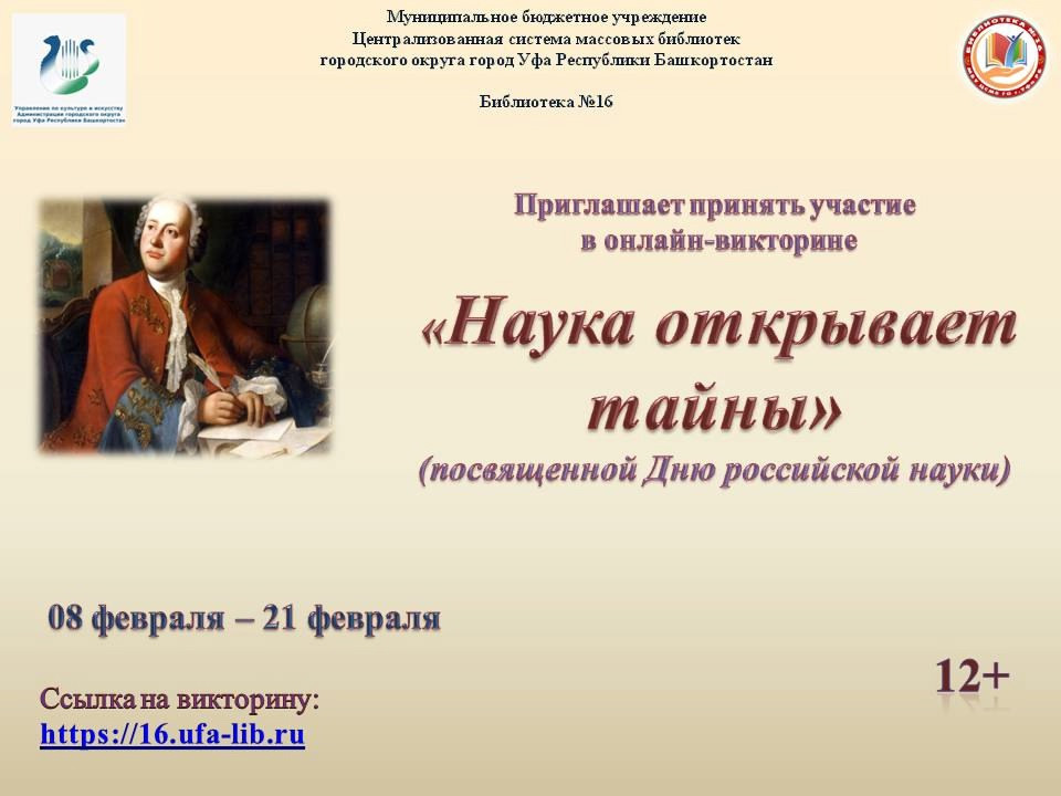 Библиотека № 16 МБУ Централизованной системы массовых библиотек ГО г. Уфа РБ проводит онлайн-викторину «Наука открывает тайны», посвященную Дню российской науки.