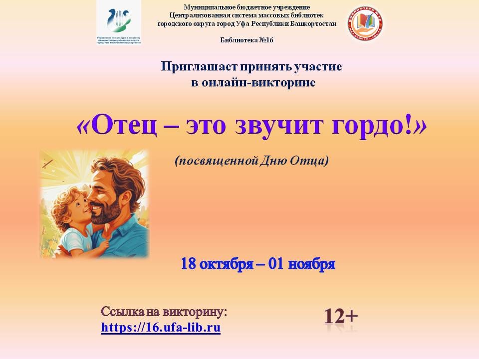 Библиотека № 16 МБУ Централизованной системы массовых библиотек ГО г. Уфа РБ проводит онлайн-викторину «Отец – это звучит гордо!», посвященную Дню Отца.