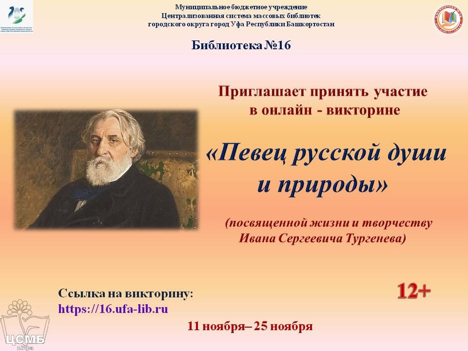 Библиотека № 16 МБУ Централизованной системы массовых библиотек ГО г. Уфа РБ проводит онлайн-викторину «Певец русской души и природы», посвященную жизни и творчеству Ивана Сергеевича Тургенева.