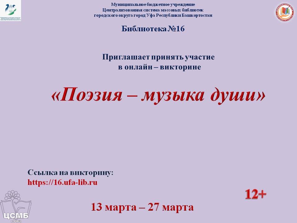 Библиотека № 16 МБУ Централизованной системы массовых библиотек ГО г. Уфа РБ проводит онлайн-викторину «Поэзия – музыка души».