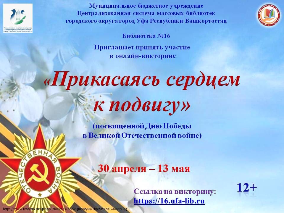 Библиотека № 16 МБУ Централизованной системы массовых библиотек ГО г. Уфа РБ проводит онлайн-викторину «Прикасаясь сердцем к подвигу», посвященную Дню Победы в Великой Отечественной войне.
