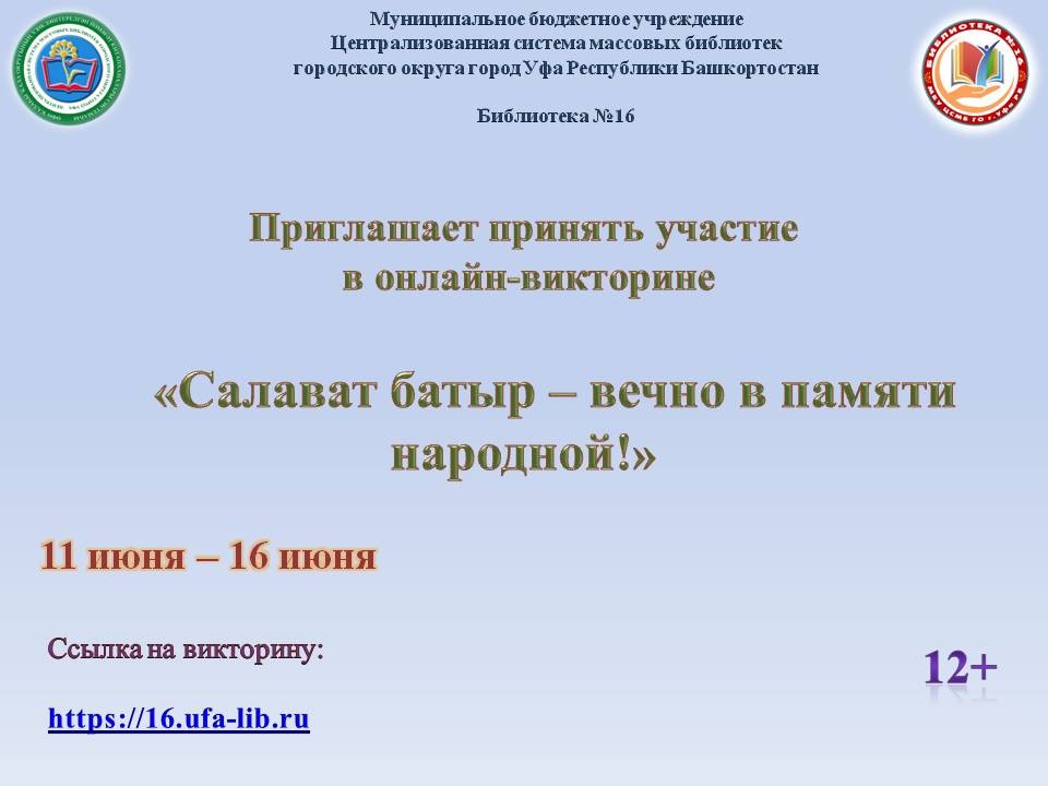 Библиотека № 16 МБУ Централизованной системы массовых библиотек ГО г. Уфа РБ проводит онлайн-викторину «Салават батыр - вечно в памяти народной!», посвященной Салавату Юлаеву.
