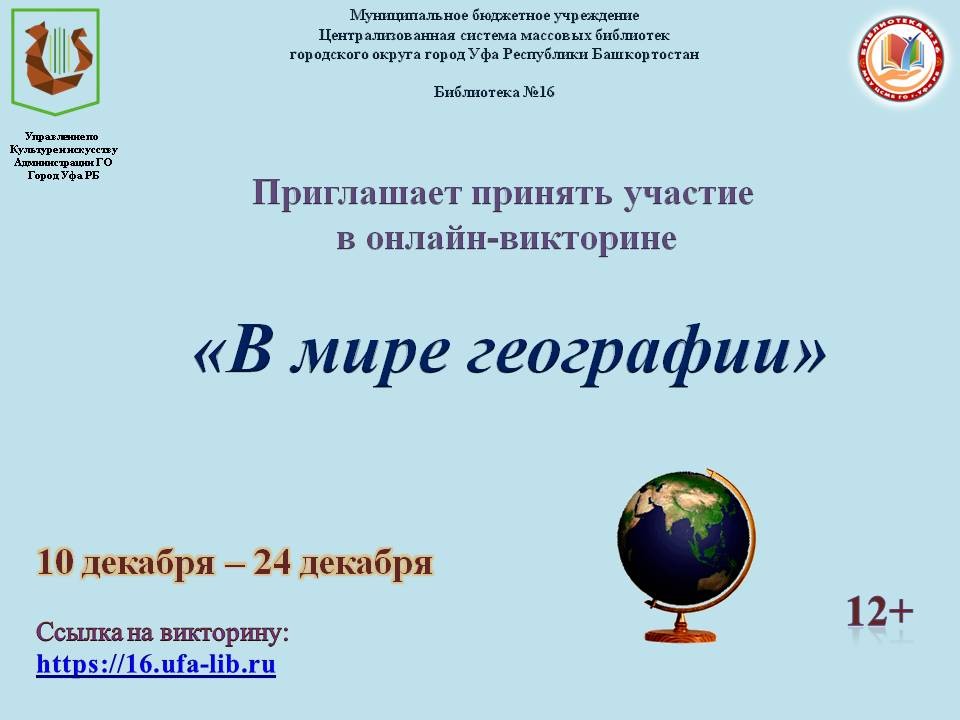 Библиотека № 16 МБУ Централизованной системы массовых библиотек ГО г. Уфа РБ проводит онлайн-викторину «В мире географии».