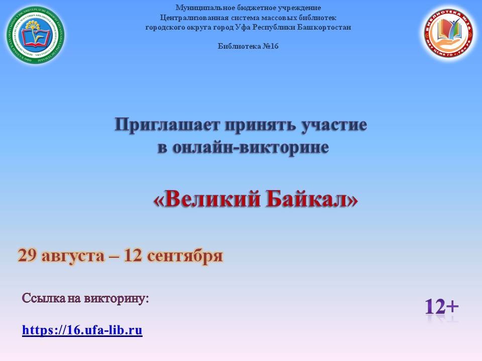 Библиотека № 16 МБУ Централизованной системы массовых библиотек ГО г. Уфа РБ проводит онлайн-викторину «Великий Байкал», посвященную уникальному месту, одному из неповторимых чудес планеты - озеру Байкал.