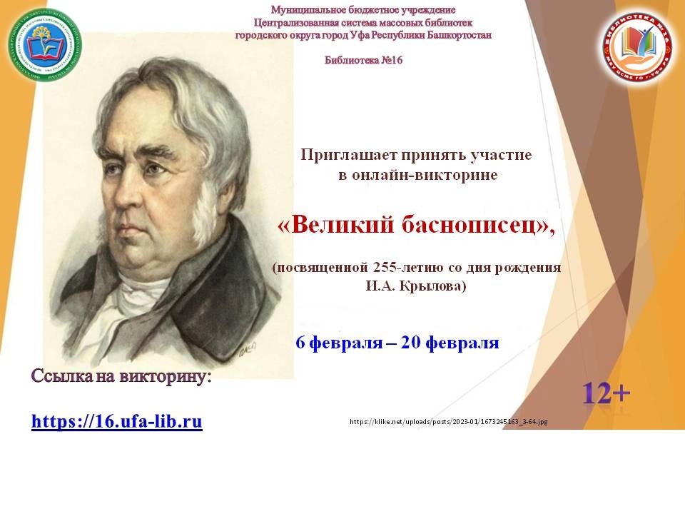 Библиотека № 16 МБУ Централизованной системы массовых библиотек ГО г. Уфа РБ проводит онлайн-викторину «Великий баснописец», посвященную 255-летию со дня рождения Ивана Андреевича Крылова.