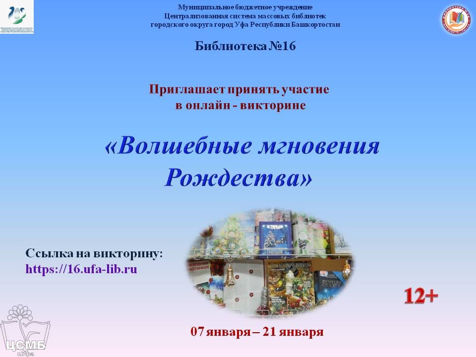 Викторина доступна на сайте библиотеки № 16 16.ufa-lib.ru/ с 07 января по 21 января до 13 часов по мск.