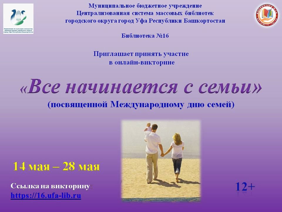 Библиотека № 16 МБУ Централизованной системы массовых библиотек ГО г. Уфа РБ проводит онлайн-викторину «Все начинается с семьи», посвященную Международному дню семей.