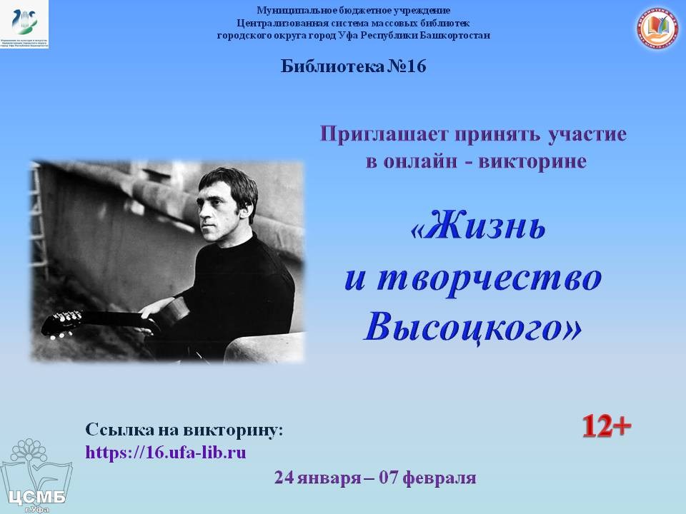 Библиотека № 16 МБУ Централизованной системы массовых библиотек ГО г. Уфа РБ проводит онлайн-викторину «Жизнь и творчество Высоцкого».