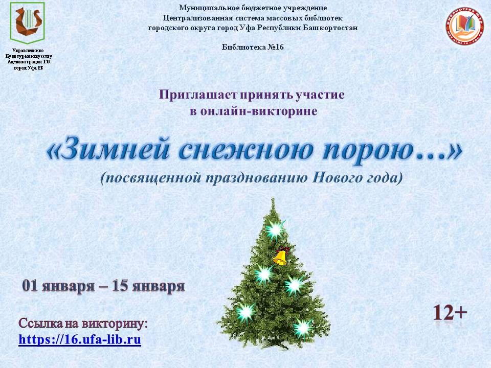 В дни новогодних каникул, Библиотека № 16 МБУ Централизованной системы массовых библиотек ГО г. Уфа РБ проводит онлайн-викторину «Зимней снежною порою…», посвященную празднованию Нового года.