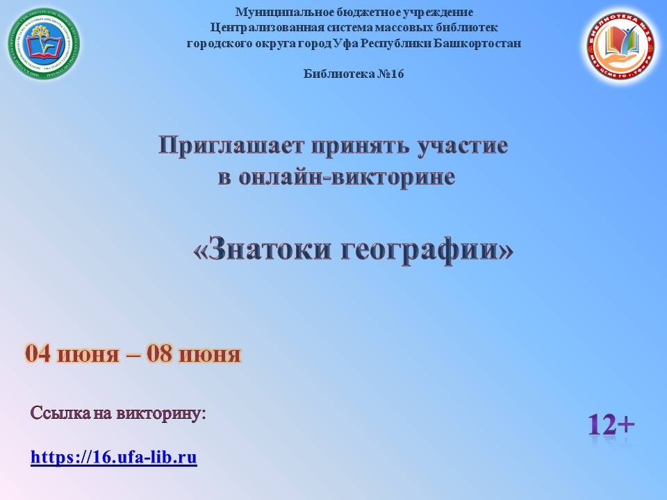 Библиотека № 16 МБУ Централизованной системы массовых библиотек ГО г. Уфа РБ проводит онлайн-викторину «Знатоки географии».
