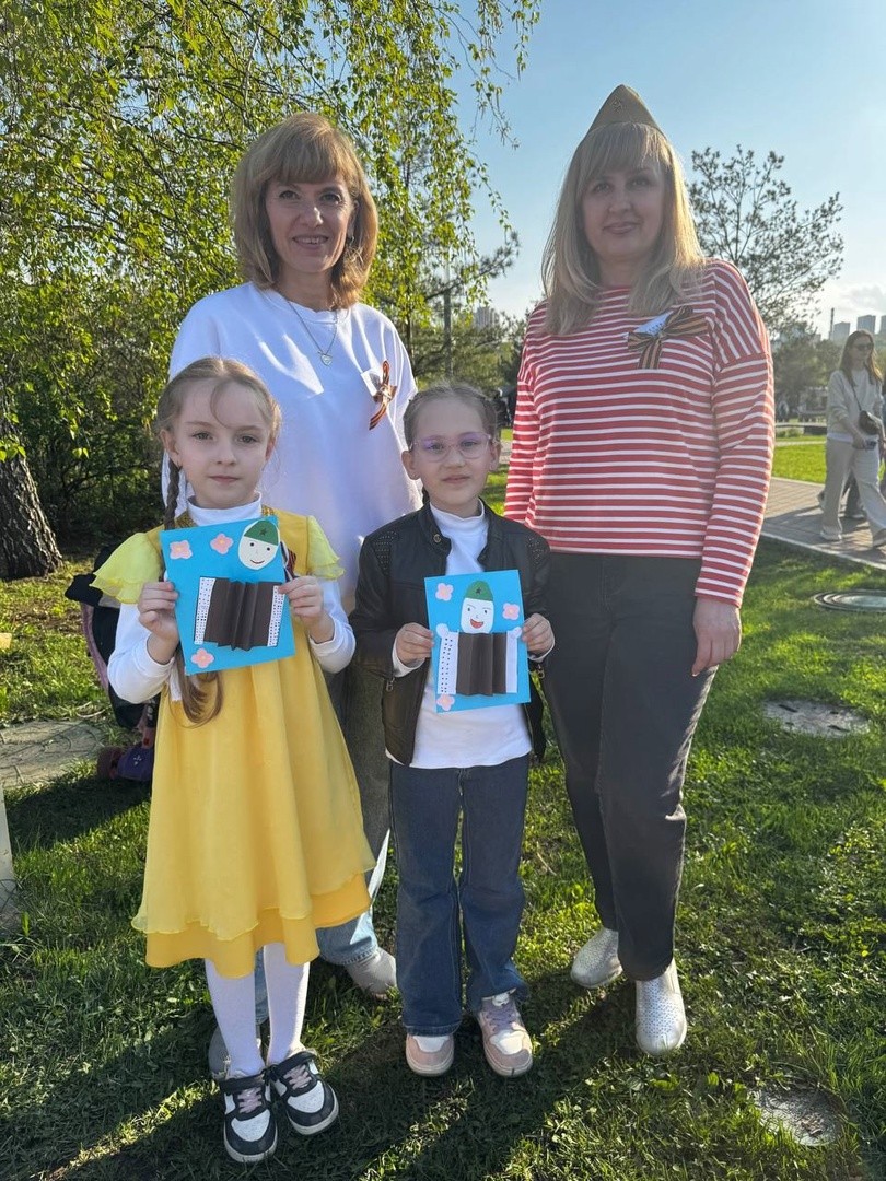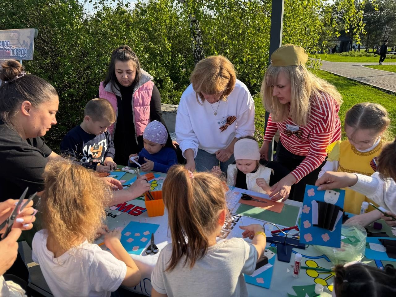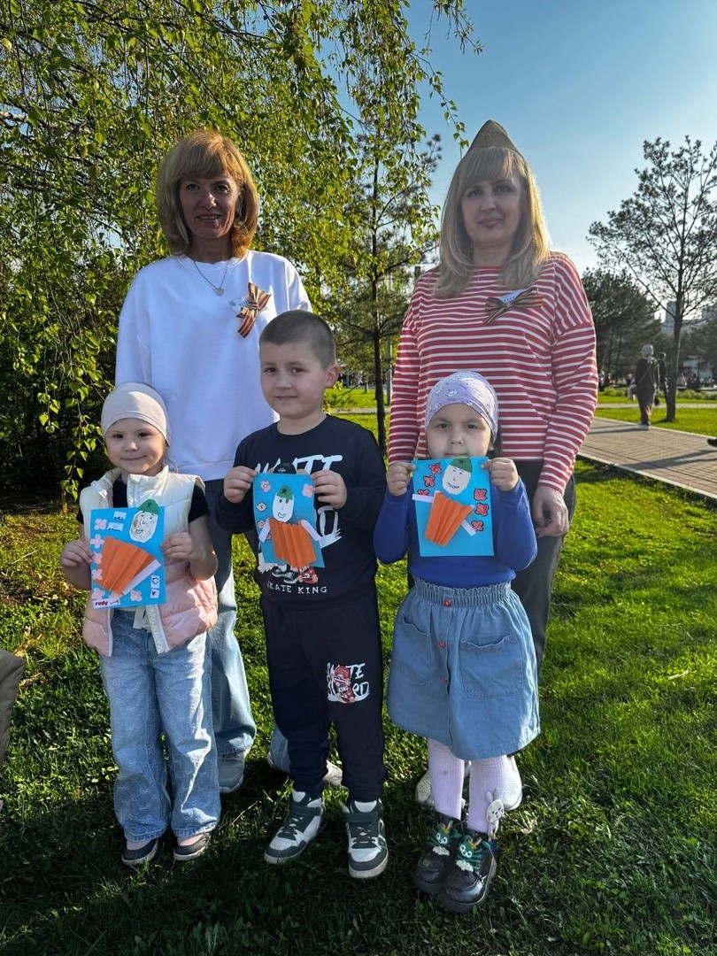 Всеобщее внимание отдыхающих семей с детьми вызвал мастер-класс по изготовлению в технике цветной аппликации открытки «Весна Победы», изображающей весёлого бойца-победителя на привале с гармонью в руках на фоне весенних цветов.