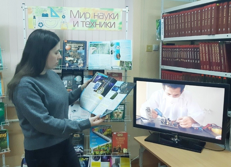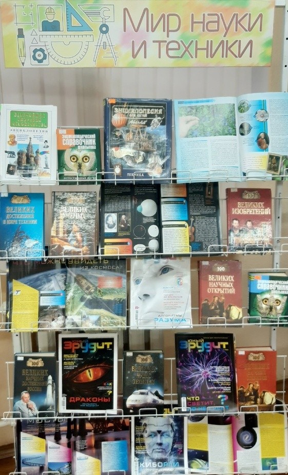 В завершение был проведен обзор книжной выставки «Мир науки и техники», на которой были представлены книги и журналы, рассказывающие о достижениях в области науки и техники, об изобретателях и их открытиях.