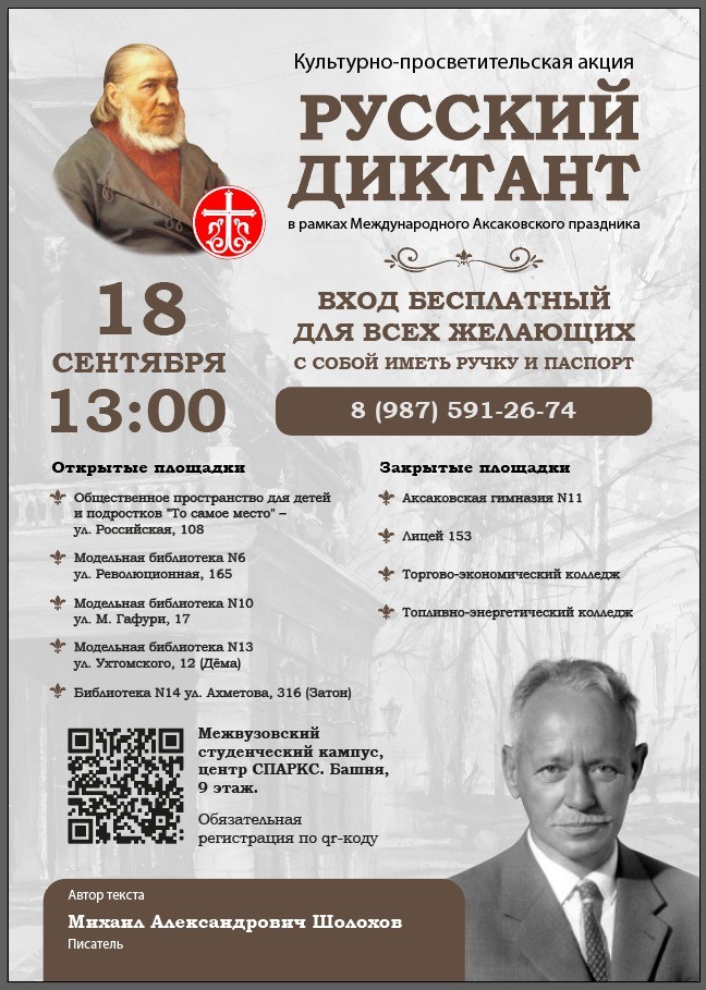 18 сентября 2025 года в рамках XXXV Международного Аксаковского праздника в Уфе пройдет Русский диктант по произведениям великого русского писателя Михаила Александровича Шолохова.