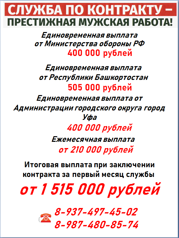 Жители республики, подписавшие контракт с министерством обороны РФ для службы в зоне проведения специальной военной операции, единовременно будут получать 505 тысяч рублей от республики. Администрация Уфы дополнительно выплатит 400 тысяч рублей. Таким образом, с учетом федеральных выплат в 400 тысяч рублей, военнослужащие от Башкирии суммарно единовременно получат 1 млн 305 тысяч рублей.