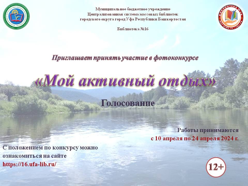 С 10 апреля по 14 мая 2024 года в Уфе проходит Фотоконкурс «Мой активный отдых». Его организатором выступает Библиотека № 16 МБУ ЦСМБ ГО г. Уфа РБ.