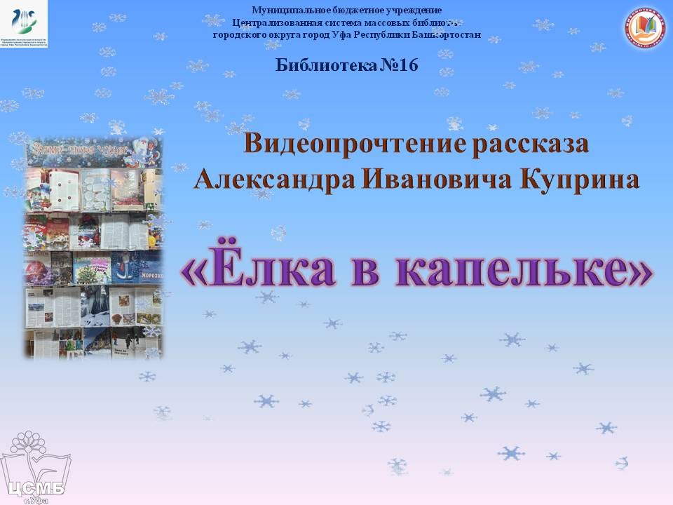 В дни новогодних каникул, Библиотека № 16 МБУ Централизованной системы массовых библиотек ГО г. Уфа РБ предлагает вашему вниманию видеопрочтение рассказа Александра Куприна «Ёлка в капельке».