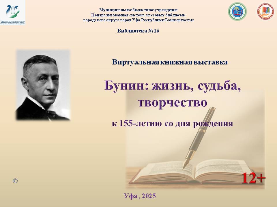 Библиотека № 16 МБУ ЦСМБ ГО г. Уфа РБ подготовила виртуальную книжную выставку «Бунин: жизнь, судьба, творчество».