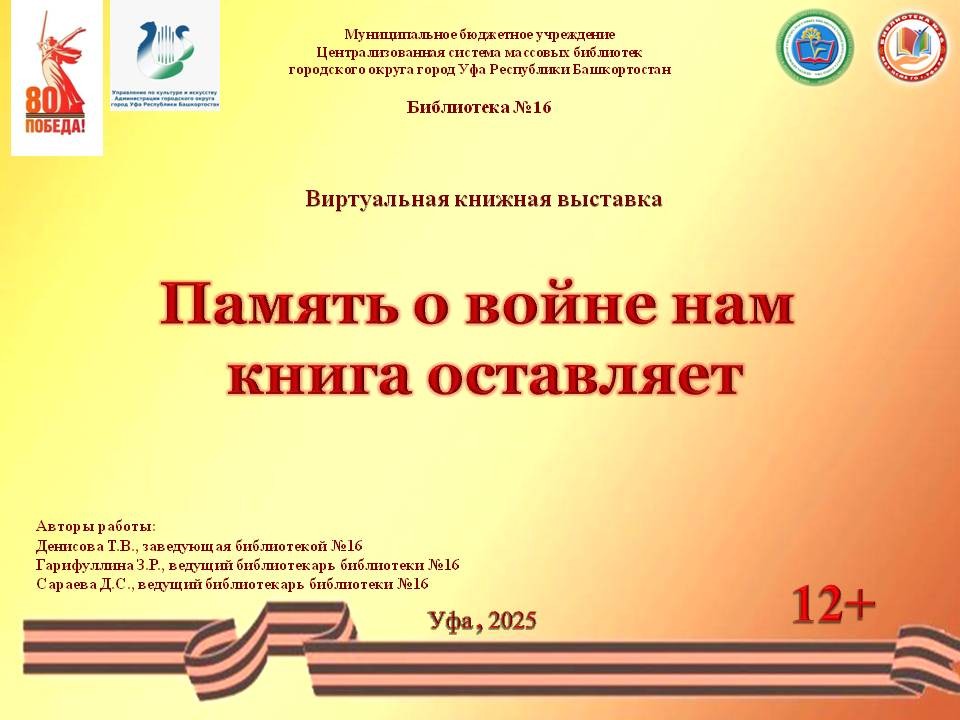 Библиотека № 16 МБУ ЦСМБ ГО г. Уфа РБ подготовила виртуальную книжную выставку «Память о войне нам книга оставляет», посвященную творчеству писателей и поэтов-фронтовиков.